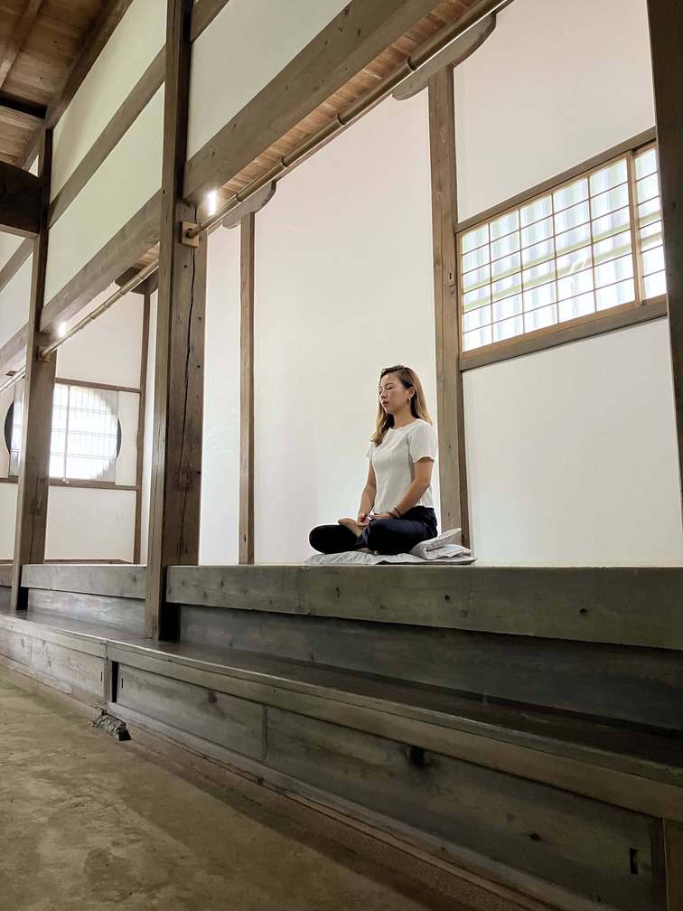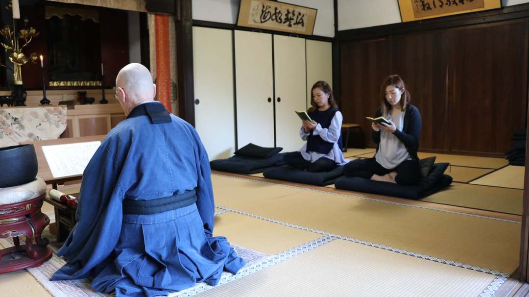 静かな本堂で姿勢と呼吸を整え、雑念を手放して心を落ち着かせる修行です。