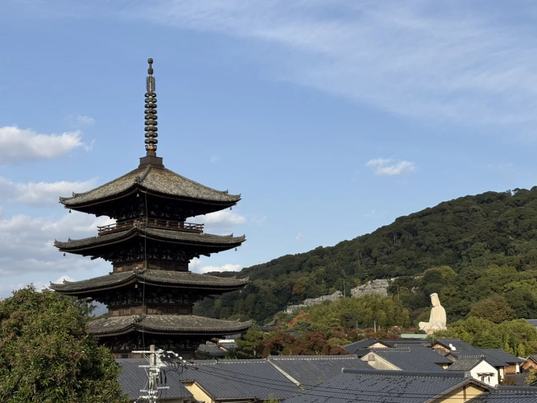 大漸寺からは古都の景観と調和する美しい五重塔が眺めることができ、本堂の天井は京都を代表する織物、西陣織となっておりこちらも大変見物であります。(写真撮影可)